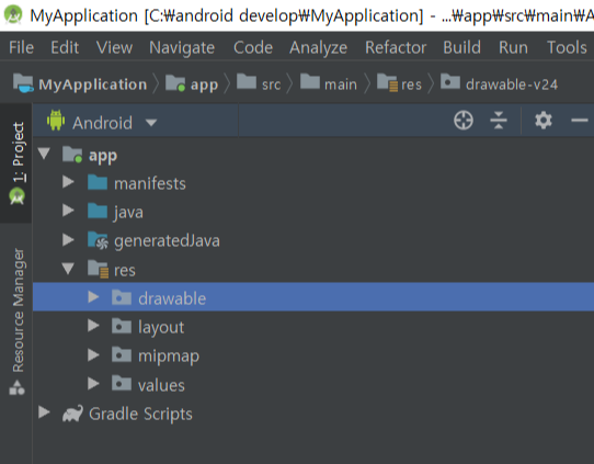 drawable은 앱에서 사용될 이미지를 저장하고 사용되는 곳이다. 이폴더 안에 이미지를 넣어두고 필요할때 이미지가 필요할때 꺼내서 사용한다고 보면 된다.