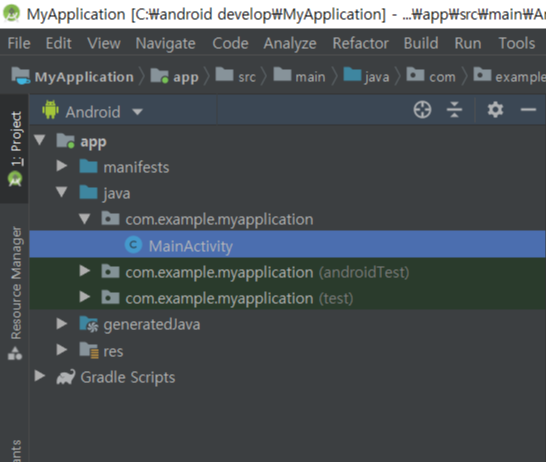 이곳에 들어가면 mainactivity를 볼 수 있는데, 프로젝트를 만들때 default로 생성된 액티비티이다. 화면을 추가하고 싶을때 activity를 만들어야한다. 첫번째 위치한 폴더(com.example.myapplication)에 만들면 된다. 클래스를 만든다던지 인터페이스를 만든다던지 하는 작업은 이 폴더 밑에서 하면된다.