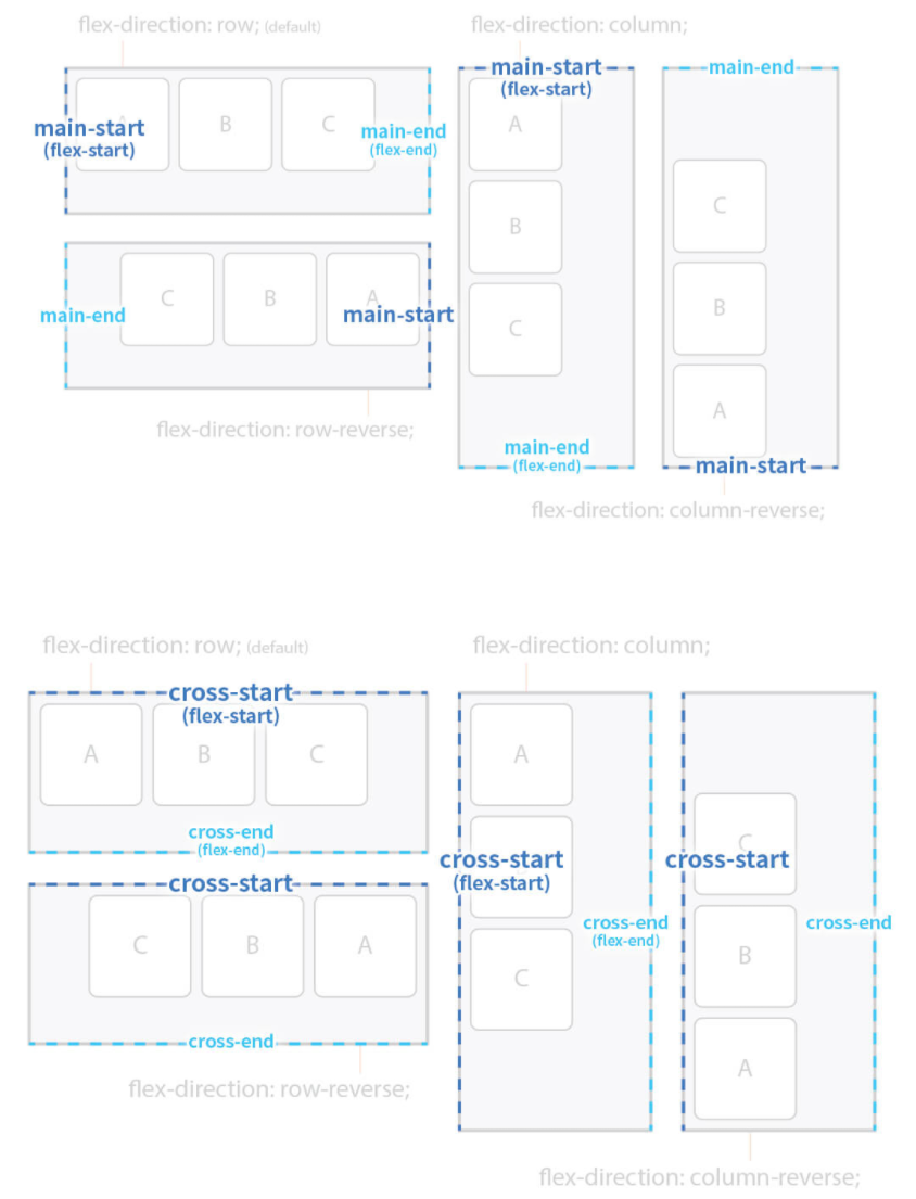 뒤에서 언급할 속성 중 값으로 flex-start와 flex-end를 사용하는데 이는 방향에 맞는 그 시작점과 끝점을 의미한다.