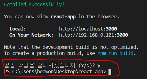 Terminal에서 Ctrl+C를 입력하면 실행을 중단하게 됩니다.