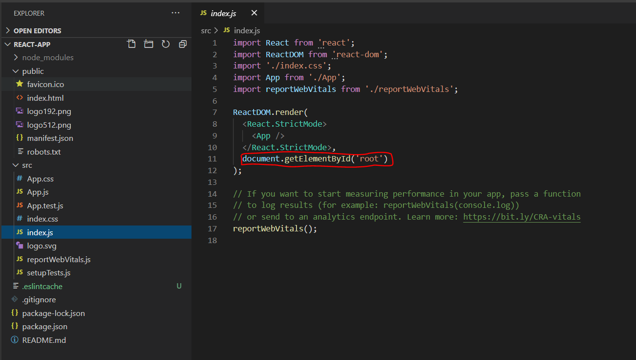 만약에 컴포넌트를 만들어갈때는 저기에 있는 "id=root"라는곳에 넣어야 합니다. create react app은 그렇게 약속을 했습니다.