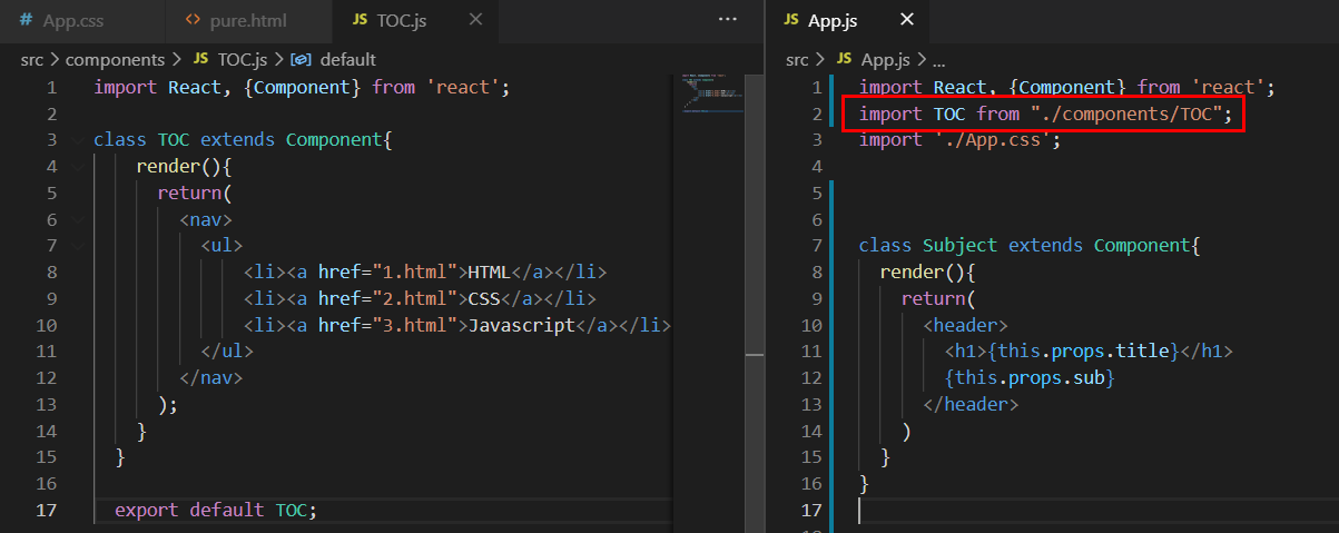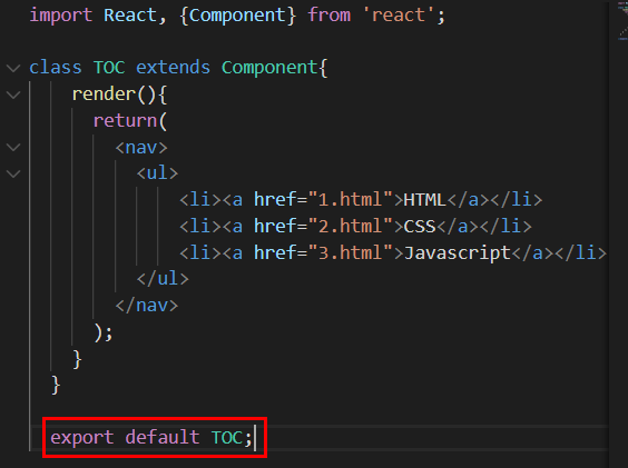 이뜻은 TOC.js라는 파일을 쓰는 다른 파일에서 export default TOC라는 코드로 인해서 TOC클래스를 사용할 수 있게 됩니다.