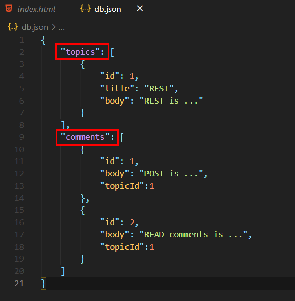 이 예시를 보면, topic, comments라는 두개의 리소스가 있습니다.