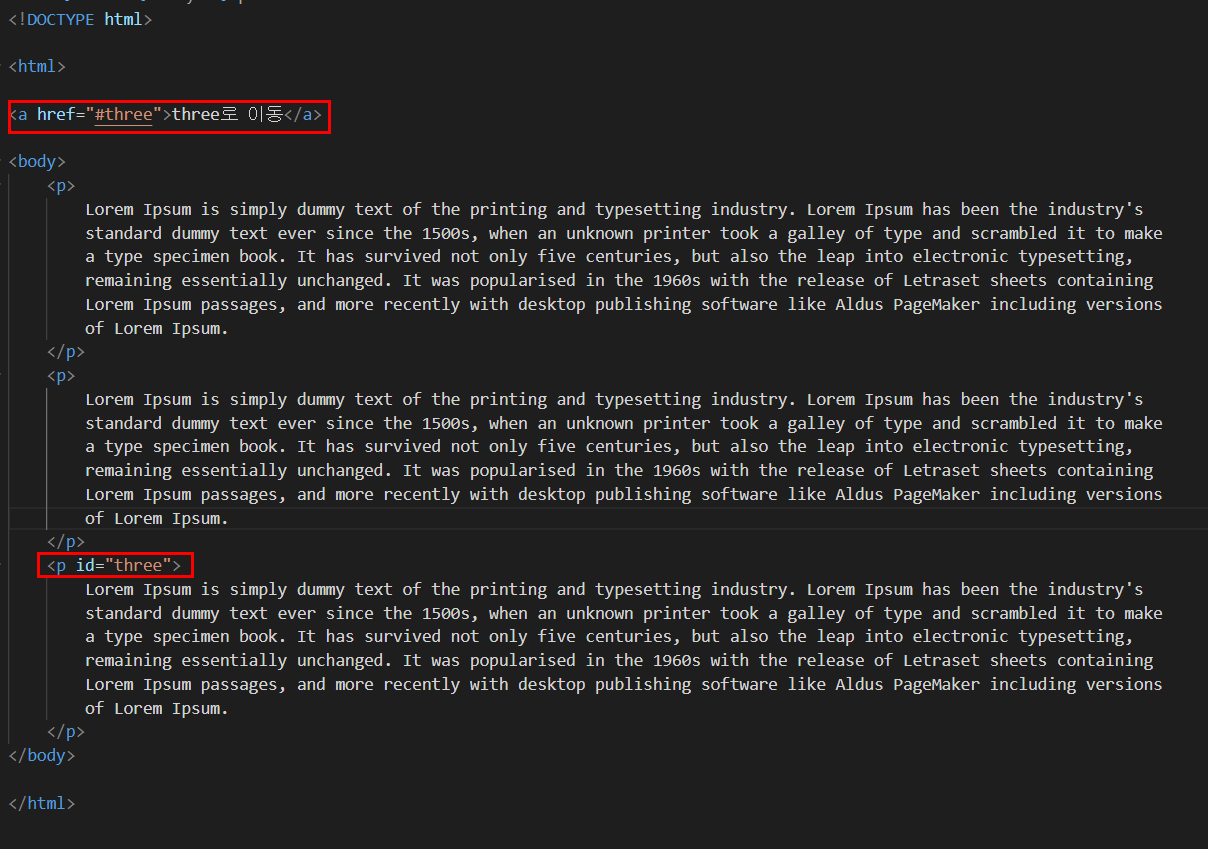 다음과 같이 태그를만들어서 화면에 three를 클릭하면 해당구역으로 이동하게 됩니다.