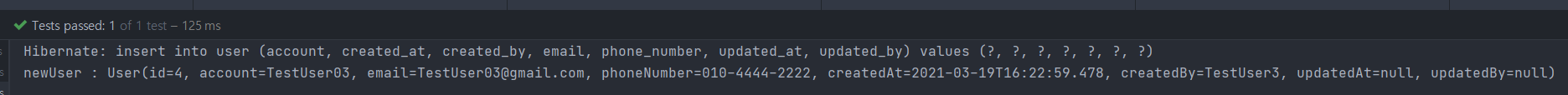 userRepository.save에서 save는 반환하는 성질이 있기 때문에, user의 새로운객체인 newUser를 이용해서 값을 출력하면, DB에 삽입한 내용 데이터를 출력한 것을 볼 수 있습니다.