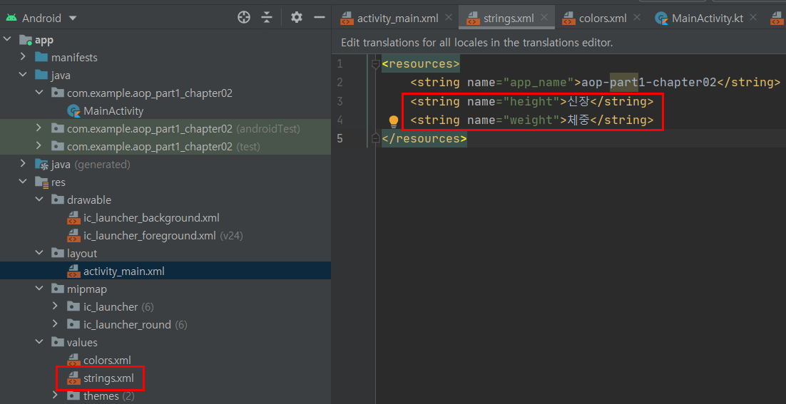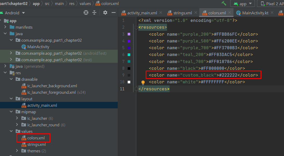 다음과 같이 values파일에 들어가면 xml파일을 볼 수 있습니다. 거기서 원하는 색깔의 값을 입력해줍니다.