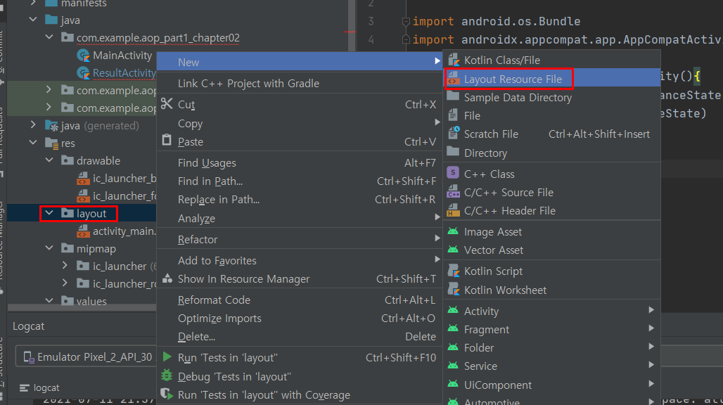 setContentView에서 표시할 화면이 없기 때문에 새로운 Layout Resource file을 만들어야 합니다.