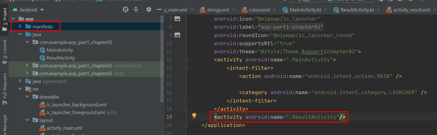 MainActivity에서 ResultActivity로 넘어가려면 2가지 과정이 있어야 합니다.