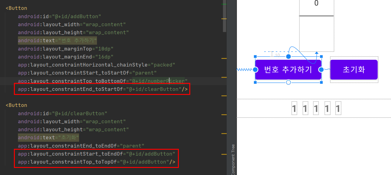 로 예를 들어봅시다. 여기서 button1 right의 constraint를 줄건데, 이건 parent의 right다. 라는 의미입니다. 즉, parent layout의 오른쪽으로 배치할거다 라는 의미입니다.