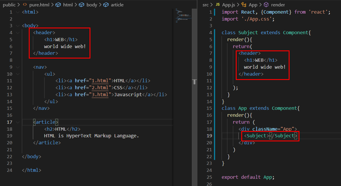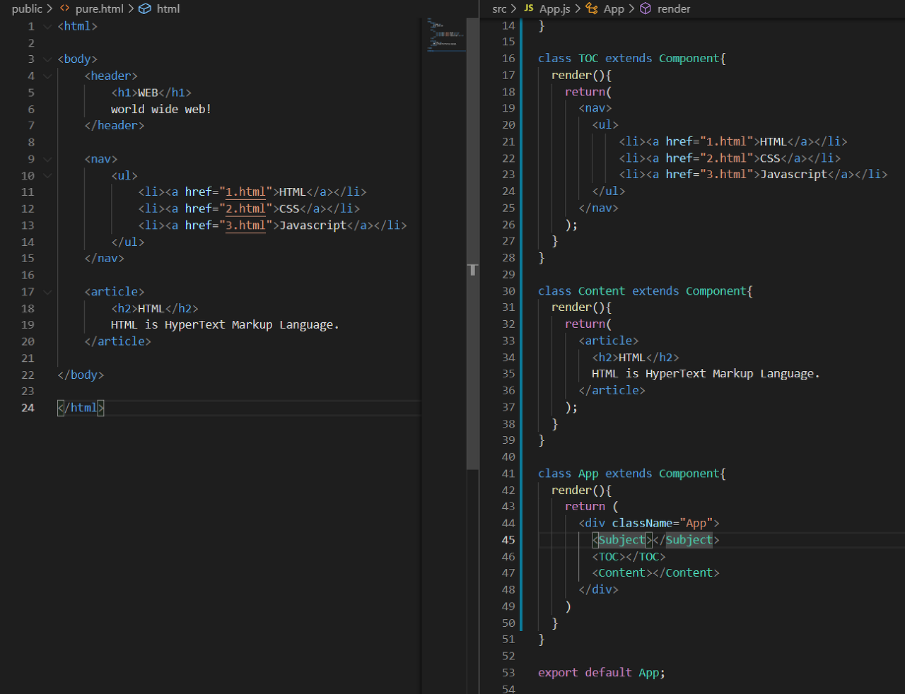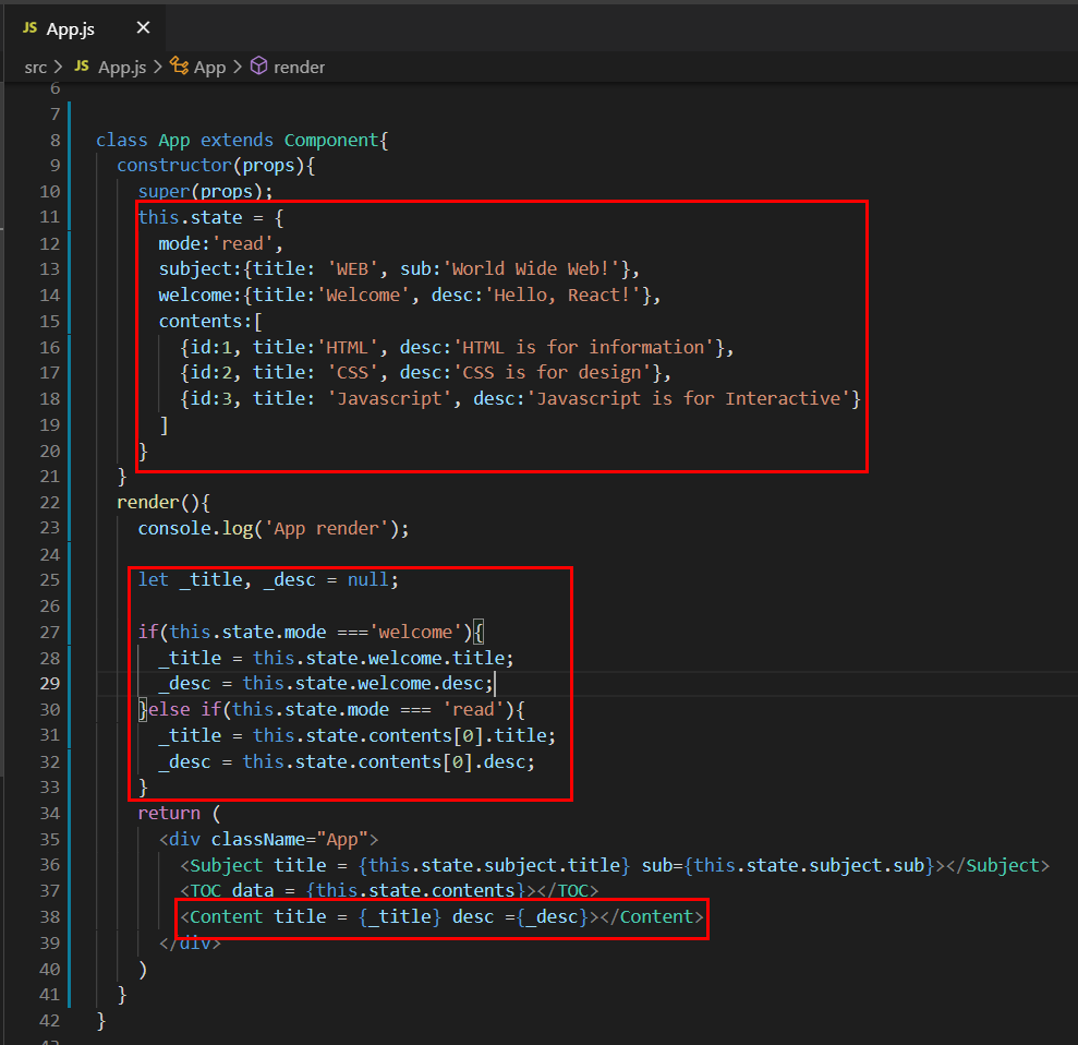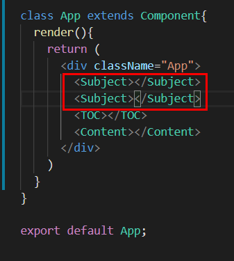 우선 Subject라는 컴포넌트를 풀어해치고 그 내용을 App에 도입시켜서 이벤트를 구현해보도록 하겠습니다. 1. 소스코드 해체하기 다음과 같이 props 형태로 잘 정리된 Subject 컴포넌트를 주석 처리를 하고, 그 밑에 Subject.js파일에 있는 소스코드를 그대로 들고와서 복사 붙혀넣기 했습니다. 2. state형식으로 수정 후 이벤트 처리해주기 이때 props형태인 소스코드를 state형식으로 바꿔줍니다. header라는 태그로 이벤트 처리를 다 하고, 다시 Subject 컴포넌트로 패키징을 해주는작업을 해줄겁니다. 이렇게 저장하고 실행을 하면 경고창이 잘 나옵니다. 하지만, 경고창에 확인을 누르면 화면이 다시 reload가 되는데, react는 reload시키지 않고도 역동적인 사이트를 만..