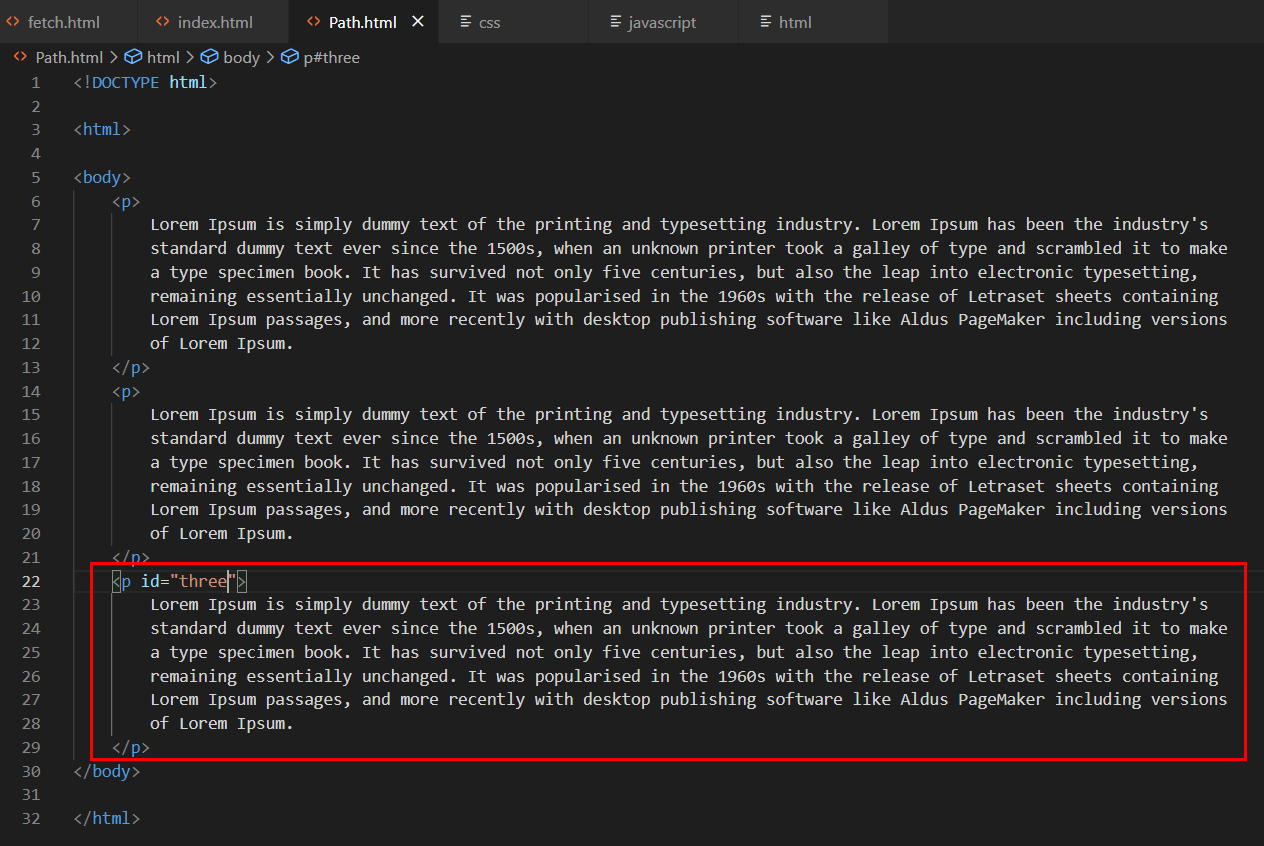 만약 id값이 three인 구역으로 이동할때, url을 이용하고 싶다면 다음과 같이 주소로 입력하면 됩니다. http://127.0.0.1:5500/Path.html#three 이런과정을 나눈다고해서 fragment라고 하고 그 fragment중에 구분짓기위해서 identifier라고 합니다. 그래서 이러한것을 fragment identifier라고 합니다. 다음과 같이 태그를만들어서 화면에 three를 클릭하면 해당구역으로 이동하게 됩니다. 해쉬값이 무엇이냐에 따라서 ajax로 다른페이지를 로드해서 시작되는페이지를 세팅할 수 있게 됩니다. three로 이동 Lorem Ipsum is simply dummy text of the printing and typesetting industry. Lorem I..