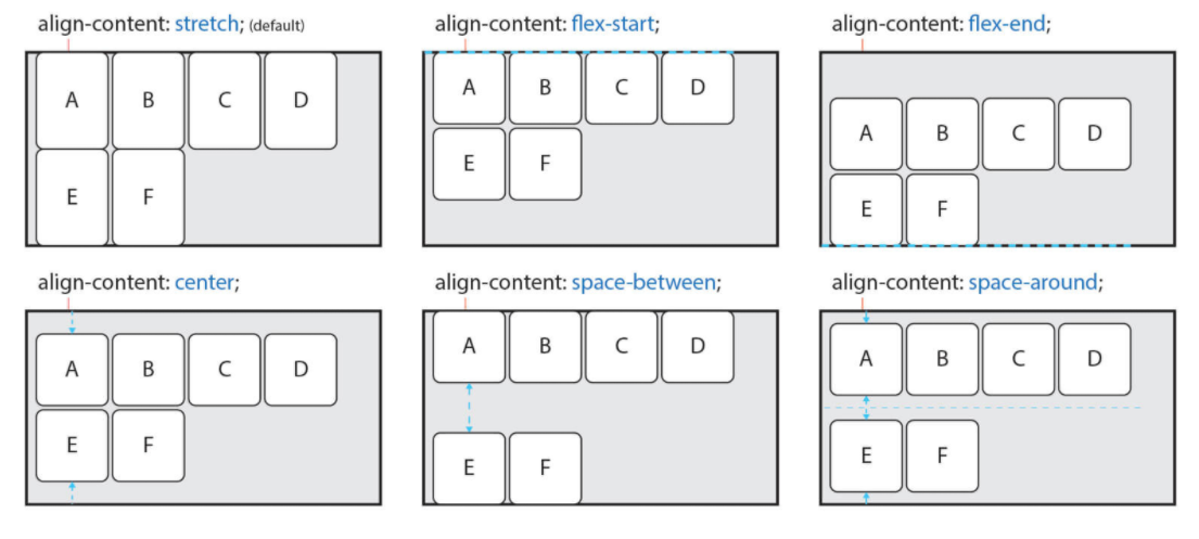 교차 축(cross-axis)의 정렬 방법을 설정한다. 주의할 점은 flex-wrap 속성을 통해 Items가 여러줄(2줄 이상)이고 여백이 있을 경우만 사용할 수 있다. Items가 한 줄일 경우 align-items 속성을 사용한다 값 의미 기본값 stretch Container의 교차 축을 채우기 위해 Items를 늘림 stretch flex-start Items를 시작점(flex-start)으로 정렬 flex-end Items를 끝점(flex-end)으로 정렬 center Items를 가운데 정렬 space-between 시작 Item은 시작점에, 마지막 Item은 끝점에 정렬되고 나머지 Items는 사이에 고르게 정렬됨 space-around Items를 균등한 여백을 포함하여 정렬 align-..