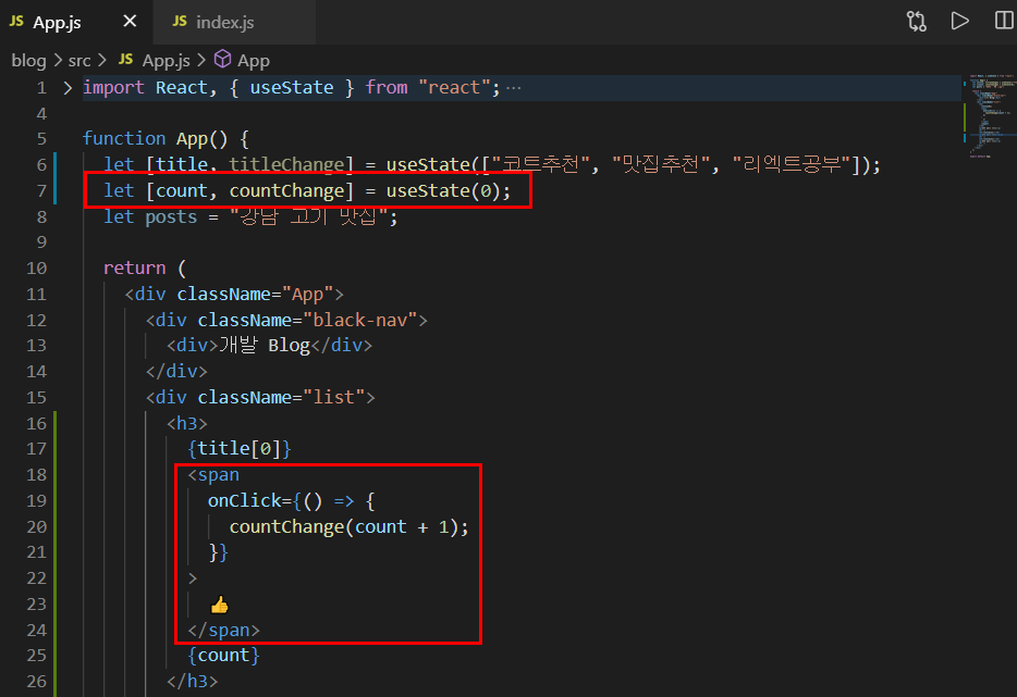 JSX 문법중 state사용하기 이제는 변수로 값을 정의하는것이 아닌 state로 값을 정하는 방법을 보여드리도록 하겠습니다. React에 있는 내장함수중 state를 사용하겠다는 뜻입니다. 즉 리엑트의 데이터 저장공간 state를 만드는 방법입니다. ES6 destructuring 문법으로 array,object에 있던 자료를 변수에 쉽게 담고싶을때 사용하는 방법을 가르쳐주도록 하겠습니다. var [a,b] = [10,100] 이렇게 선언한다면 a=10, b=100인 상태가 됩니다. 다음과 같이 선언하면 title = '코트 추천' 이라는 값이 성립이 됩니다. 그래서 h3안에 title을 넣었으므로 출력값은 '코트 추천'이라고 나오게 될겁니다. 두번째 변수인 titleChange는 앞으로 바뀌는 데이터값을 받아오는 용으로 쓰겠습니다... React/기초 2021.02.12