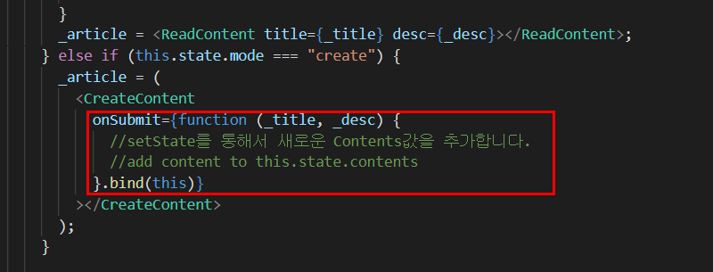 onSubmit 이벤트 (이벤트함수 생성, 디버깅으로 값 확인, 인자넣어주기, 매개변수넣어주고 출력 확인하기) 1. 이벤트 함수 생성 else if에 선언한 가 어떻게 동작할지 onSubmit이벤트로 처리해줍니다. _title, _desc 값으로 컨텐츠값을 더해주도록 만들어줍니다. 2. 디버깅으로 값 확인 onSubmit 함수에서 App.js에 있는 내용이 실행되도록 합니다. 3. 일단 debugger을 입력해줘서 e에 있는 이벤트객체를 잘 찾아줍니다. value값이 잘 들어갔는지 확인하기 위해서 e.target.title.value를 입력해줍니다. 다행이 "react"로 잘 들어왔네요. 이것으로 CreateContent.js파일에 이벤트처리에 인자 값을 무엇을 넣어줄지 정해지게 됩니다. 3. 인자 넣어주기 onSubmit이벤트에 인자로 e.target.title.value 와 e.target.desc.value.. React/create 구현 2021.02.09