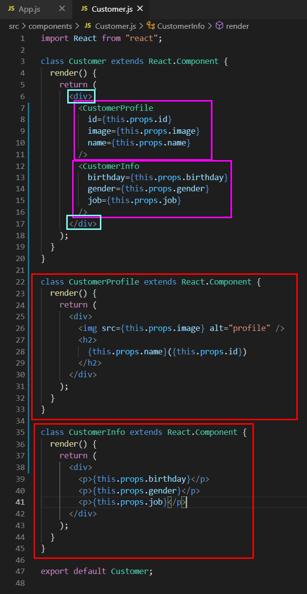 컴포넌트 분리하기 (구조화하기) feat.map & key 컴포넌트를 적절히 잘 분리하면 유지보수도 쉬워지고, 생산성도 높아지는 특징이 있습니다. JSX 문법의 특징중 componenet를 추가하려고하면 div태그 안에 넣어서 해야합니다. 안그러면 오류납니다. 또한, 다음과같이 클래스를 분리해서 필요한 클래스를 최종 클래스안에 계층적으로 나타내는것이 좋은 방법입니다. 다음은 복수로 나타내기때문에 배열로 표현하겠습니다. 여기서 보면 알 수 있듯이, 여러번 customer컴포넌트를 입력해야하는 불편함이 있습니다. **map을 이용해봅시다** 다음과 같이 선언하면 오류가 납니다. 이것에 대한 식별값인 key값이 없기 때문입니다. *key를 사용해봅시다* 아까전에 소스코드보면 알 수 있듯이, id값은 각각 다르기 때문에 key값으로 합니다. React/컴포넌트 2021.02.11