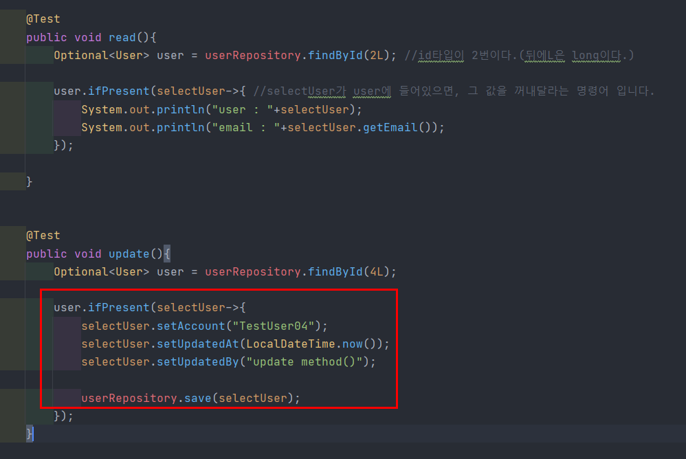 CRUD 중 read를 봅시다. repository와 entity 설정을 다 해놓았기 때문에, userRepository.find~의 명령어를 써도 해당 내용을 읽어 올 수 있습니다. Optional user 는 자바를 공부하면 알 수 있지만, 제네릭타입을 받게 되어있습니다. selectUser가 있는부분에 user라고 동일하게 선언하면, 이름이 똑같기 때문에 오류가 나서, selectUser라고 선언했습니다. 그래서 selecrUser가 user에 들어있으면, 그 값을 꺼내달라는 명령어 입니다. SpringBoot/JPA 2021.03.19