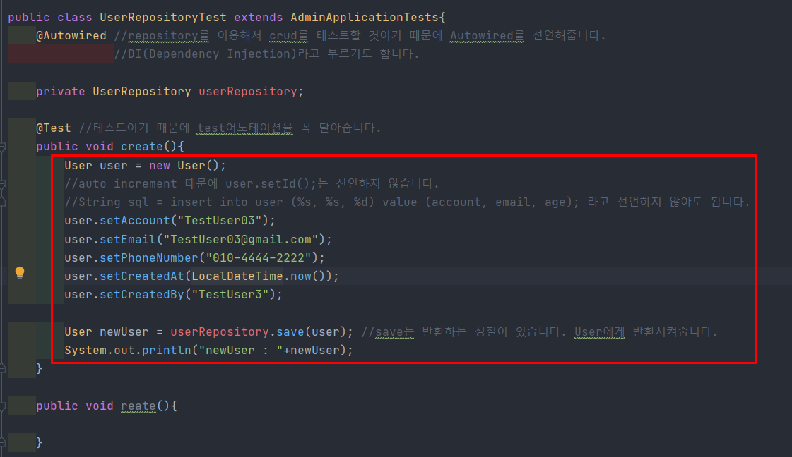 CRUD 중 create를 봅시다. User객체를 생성해줍니다. 객체를 생성해줌으로써, query문을 사용하지않고, 객체로도 데이터베이스에 데이터를 삽입 해 줄 수 있습니다. 또한 setId부분은 auto increment이기 때문에 따로 값을 세팅하지 않아도 알아서 값이 설정이 잘 됩니다. userRepository.save에서 save는 반환하는 성질이 있기 때문에, user의 새로운객체인 newUser를 이용해서 값을 출력하면, DB에 삽입한 내용 데이터를 출력한 것을 볼 수 있습니다. 출력된 값을 보면, 잘 출력이 된것을 알 수 있습니다. SpringBoot/JPA 2021.03.19