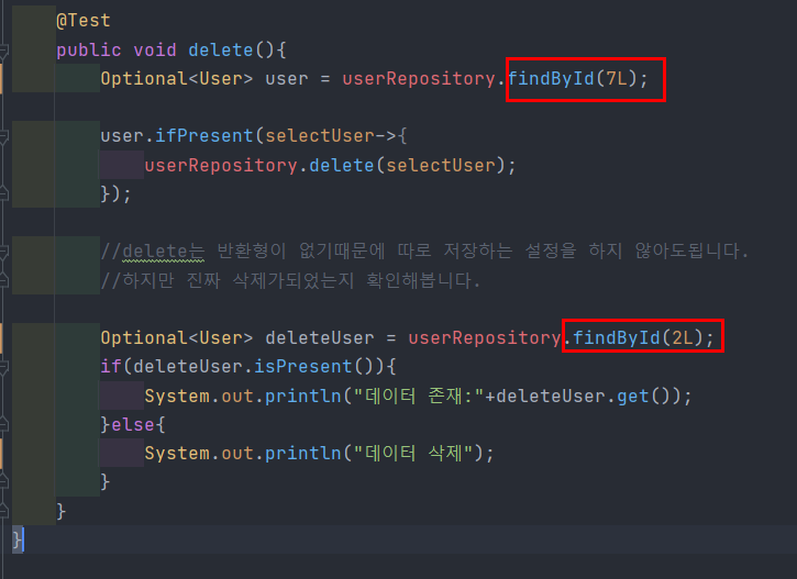 CRUD중 delete를 봅시다. 다음은 delete 하는 과정을 보여주는겁니다. user는 7L의 데이터를 찾아내서 그것을 지우는 과정을 하고있고, deleteUser는 2L을 찾아서 데이터가 삭제되었는지 확인해주는 소스코드 입니다. 여기서 보면 알 수 있듯이, 2L은 데이터가 존재하기 때문에 콘솔에 찍혀서 확인 할 수 있습니다. SpringBoot/JPA 2021.03.19