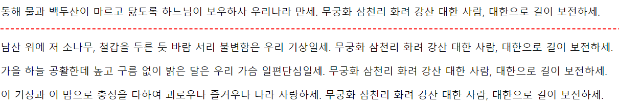 서식이 미리 지정된 텍스트를 설정한다. (Preformatted Text) 텍스트의 공백과 줄바꿈을 유지하여 표시할 수 있다. 기본적으로 Monospace 글꼴 계열로 표시된다. pre {display : block;} 만약에 pre태그를 사용하지 않는다면, 다음과 같이 출력이 된다. 동해 물과 백두산이 마르고 닳도록 하느님이 보우하사 우리나라 만세. 무궁화 삼천리 화려 강산 대한 사람, 대한으로 길이 보전하세. 출력된 값에서 볼 수 있듯이, 동해물과 사이에 띄어쓰기 10칸도 적용이 하나도 되어있지 않고, 닳도로고가 만세 등드에서 앤터한 부분도 적용이 하나도 안된것을 볼 수 있다. 하지만 pre태그를 사용한다면, 동해 물과 백두산이 마르고 닳도록 하느님이 보우하사 우리나라 만세. 무궁화 삼천리 화려 강산..