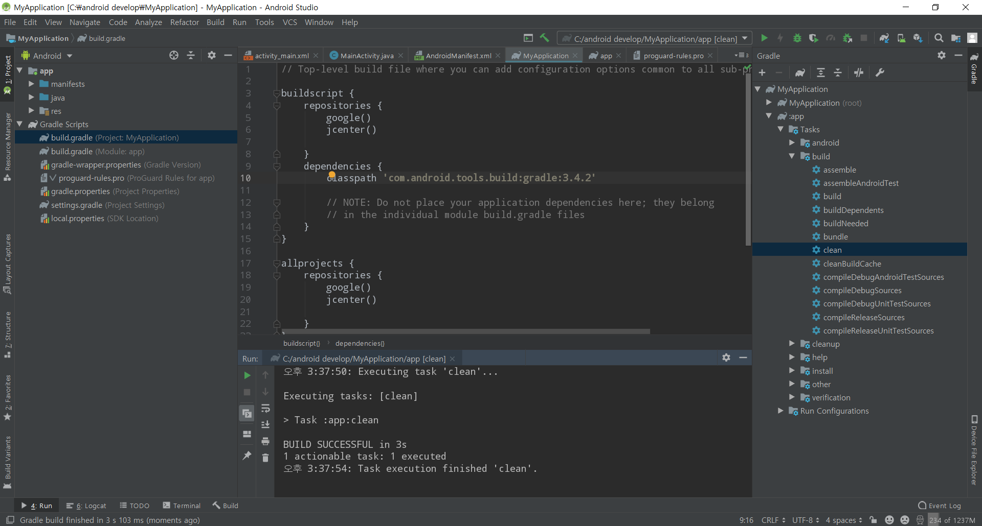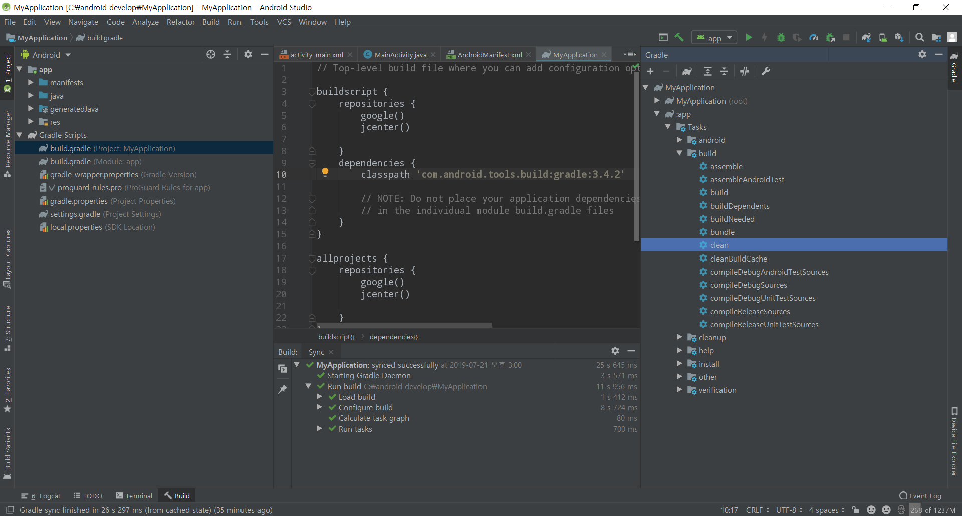 또한 오른쪽 화면에 gradle을 누르고 파랗게 눌려있는 부분(clean)을 누르게 된다면 빌드의 모든것이 다 지워지게된다. 빌드는 하나도 안되어있고 정말 글씨만 써져있는 상태로 초기화 시켜버리게 된다는 것이다.