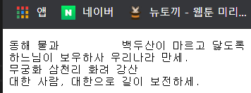 출력된 값에서 볼 수 있듯이, 동해물과 사이에 띄어쓰기 10칸도 적용이 하나도 되어있지 않고, 닳도로고가 만세 등드에서 앤터한 부분도 적용이 하나도 안된것을 볼 수 있다.