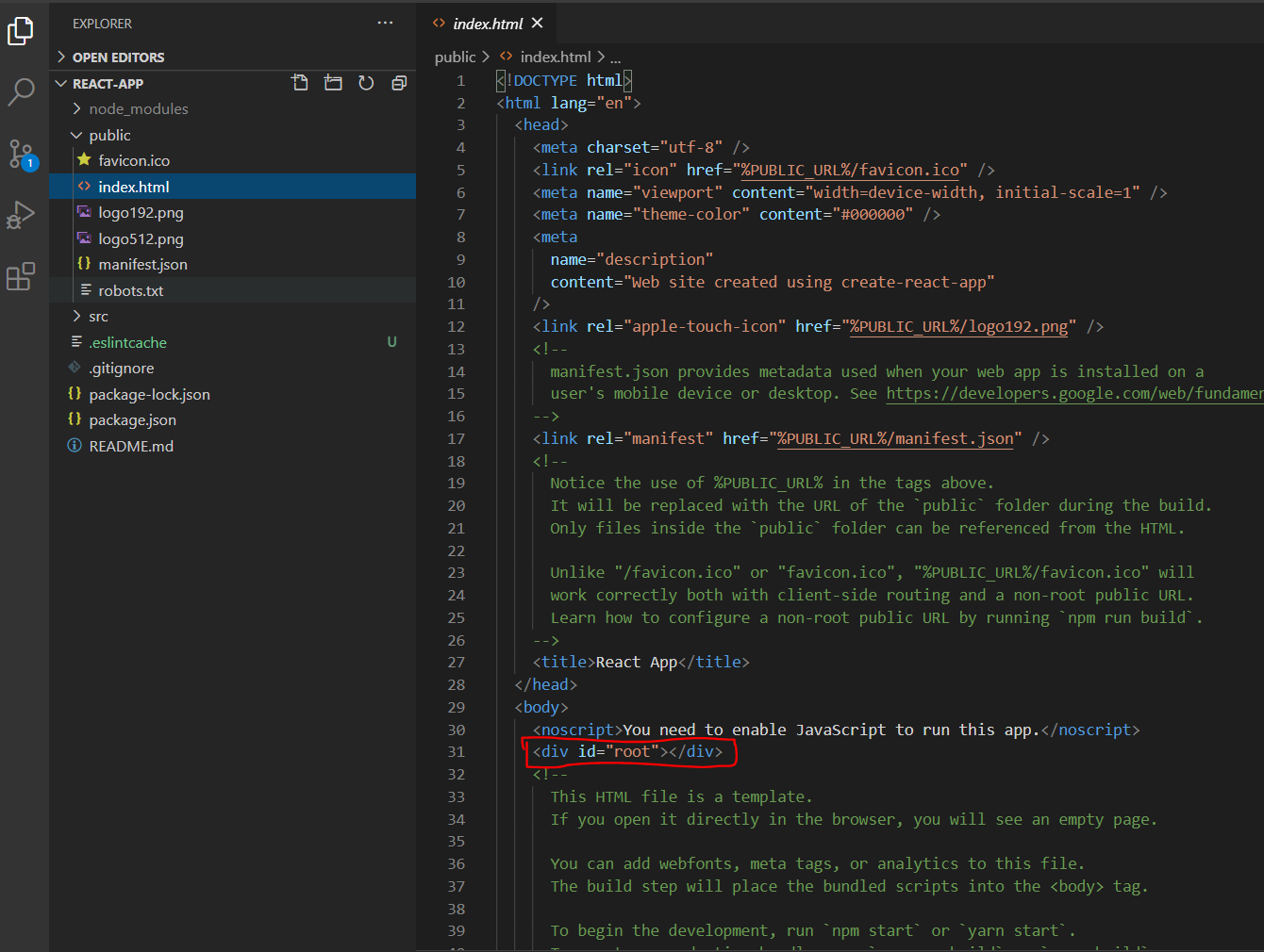 만약에 컴포넌트를 만들어갈때는 저기에 있는 "id=root"라는곳에 넣어야 합니다. create react app은 그렇게 약속을 했습니다.