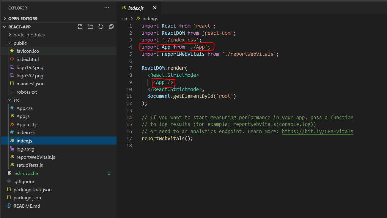 그 App이라는 컴포넌트의 실제구현은 상단에 있는 " import App from './App' "으로 된것을 확인 하실 수 있습니다. 이것은 ./App.js가 풀내임이고 js가 생략된것입니다.