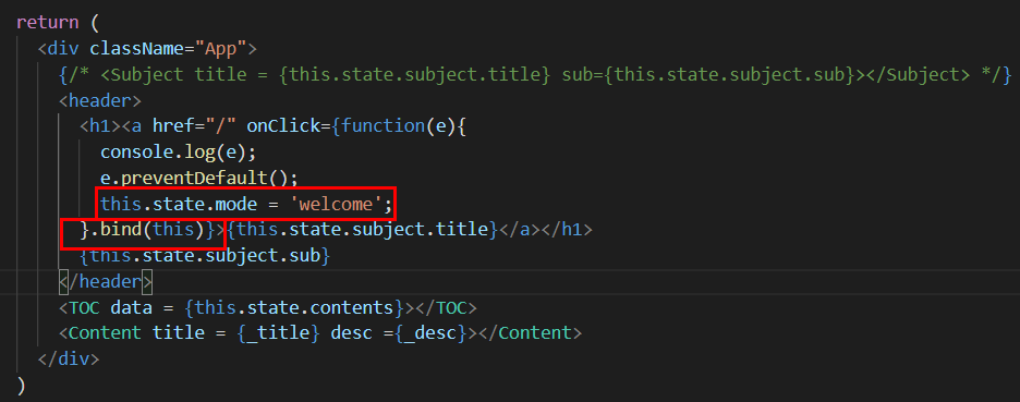 바로 이벤트 함수가 끝난 후, bind(this)를 선언해줍니다. 왜냐하면 무작정 event함수안에 this를 선언해버리면