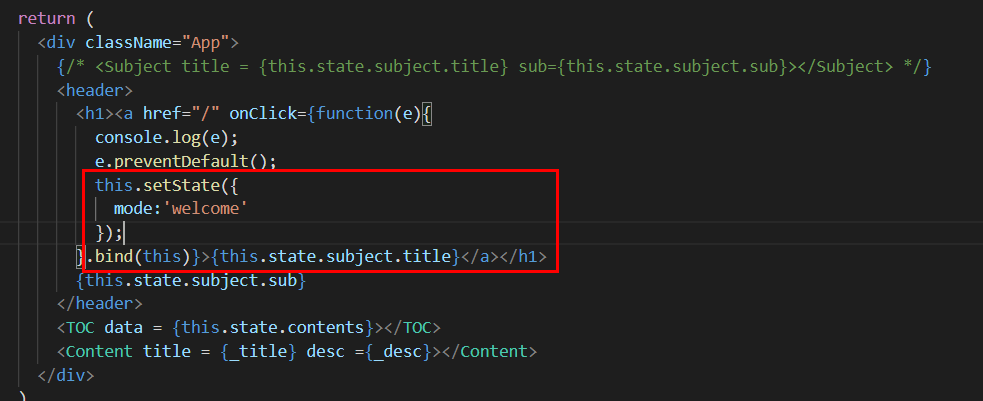 그런데 이렇게 선언해도 문제가 됩니다. this.state.mode = 'welcome' 은 state값이 변한다는걸 모르게하는 소스코드이기 때문이죠.