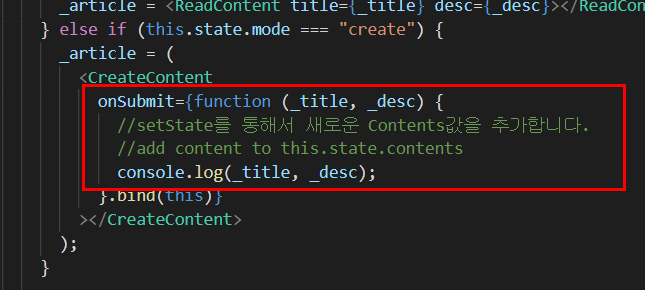 이것으로 CreateContent.js파일에 이벤트처리에 인자 값을 무엇을 넣어줄지 정해지게 됩니다.