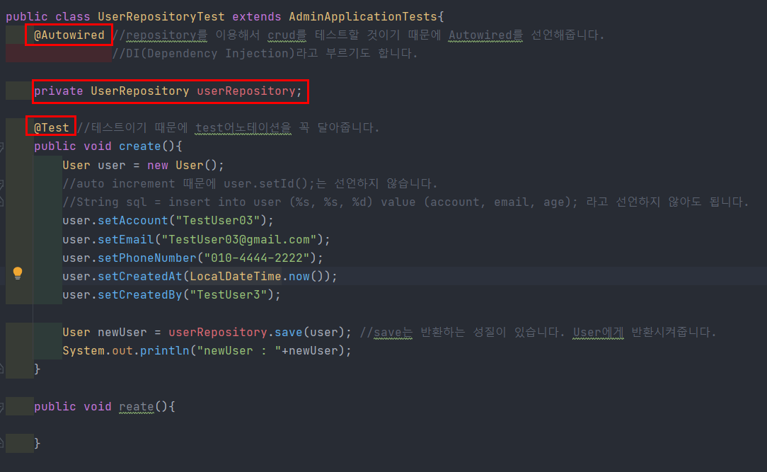 repository를 이용해서 crud를 테스트할 것이기 때문에 Autowired를 선언해줍니다.