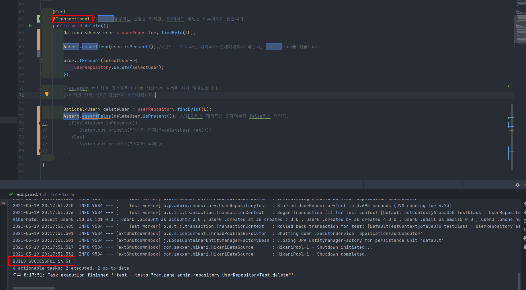 Assert.assertTrue(); & @Transactional