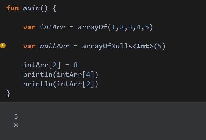 만약 null값을 가진 배열을 선언하고 싶다면 arrayOfNulls함수에 크기를 지정하면 null로 채워진 배열이 만들어 집니다.